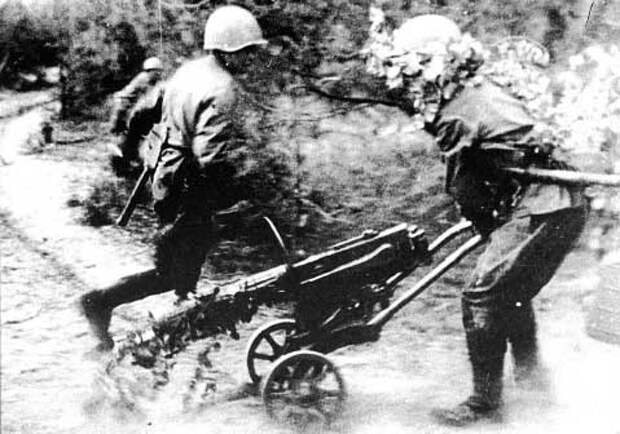 Помню какую-то деревню и небольшую высоту перед ней, справа –заболоченная речушка, слева – открытое поле, которое было нашпиговано минами, мы попытались его обойти, но попали под огонь замаскированных русских танков. Значит выход один – через эту деревню, но там засели в домах русские, а с высоты по нам стрелял русский станковый пулемёт, и у нас появились потери. Высоту закидывали минами, но как только взрывы стихали, пулемёт оживал и снова укладывал нас на землю. Спустя час русские из деревни ушли, огонь оттуда прекратился, но чёртов пулемёт не умолкал. Наши миномётчики никак не могли заставить его замолчать.