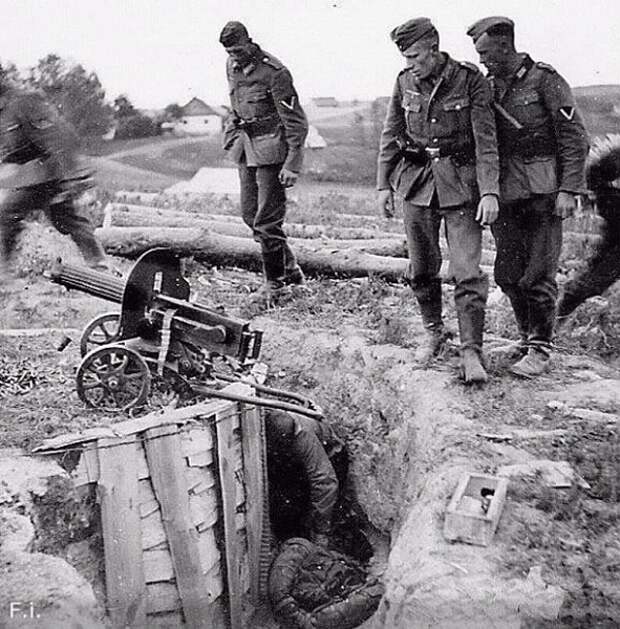 Это окрестности Сталинграда, август 1942 года. Группа немецких солдат стоит над окопом и рассматривает погибших советских пулемётчиков.