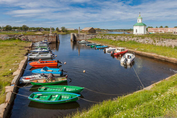 Фото 33. Большой перепад уровня воды между Святым озером и морем, а также излишки воды в озере, которые приходилось по каналам сбрасываются в море, позволили построить на каналах несколько гидротехнических сооружений. В XVII веке - водяную мельницу, а в 1801 году - сухой водоналивной док, явившийся одним из первых сухих доков в России. В настоящее время используется как парковка для водного транспорта местных жителей: