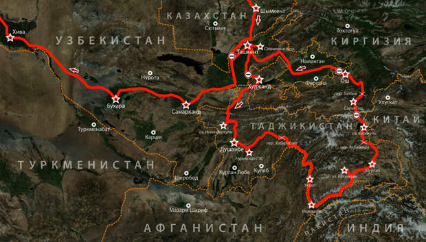 Наш маршрут правильно считывать в следующем порядке: Москва—Шымкент—Ташкент—Худжанд—Душанбе—Хорог—Мургаб—Ош—Ташкент—Самарканд—Бухара—Хива—Москва.