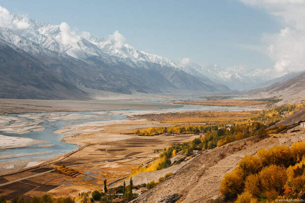 Узкая река Памир — естественная граница Таджикистана и Афганистана. На другом берегу шлепает афганский караван.