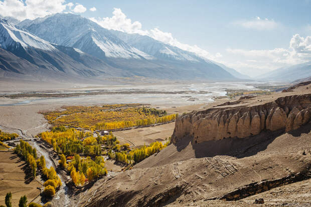 Памир. Развалины старой крепости, долина реки Пяндж и горы Афганистана.