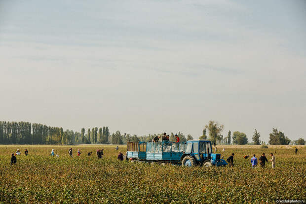 При сборе большой части урожая «белого золота» Узбекистана ежегодно принудительно используется труд детей, которых свозят с соседних областей страны. Многие правозащитники активно борются с этим злом через суды, фотографируя и снимая нарушения на видео. Поэтому хлопковые поля охраняются. Но мы всего этого не знали. Поэтому крайне удивились, когда какой-то мужик из поля с красными глазами в черной кожаной куртке начал на нас орать и требовать паспорта и документы туристов. Параллельно он постоянно звонил каким-то ребятам и в милицию.