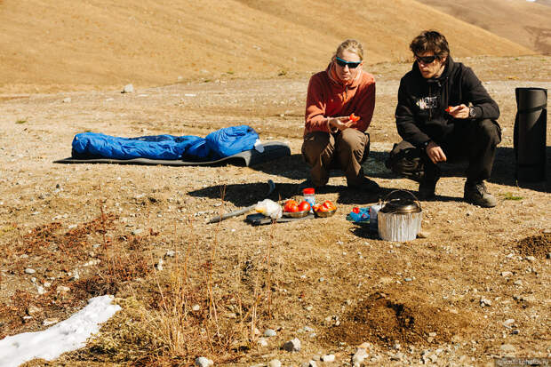 Мы снова ночевали в палатках, и чем выше нас заносило в горы, тем холоднее были ночи. Палатки покрывались инеем и долго высыхали. Во время привалов мы вытаскивали палатки и спальники на солнце и сушили.