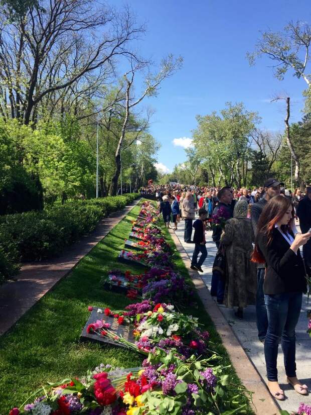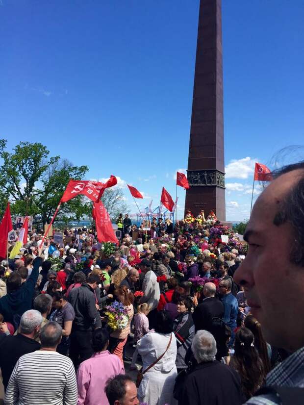 Корреспондент издания «Таймер» зафиксировал, как тысячи людей, собравшихся на Аллее Славы под Знаменами Победы, скандируют: «Вон из Одессы, бандеровские бесы!».
