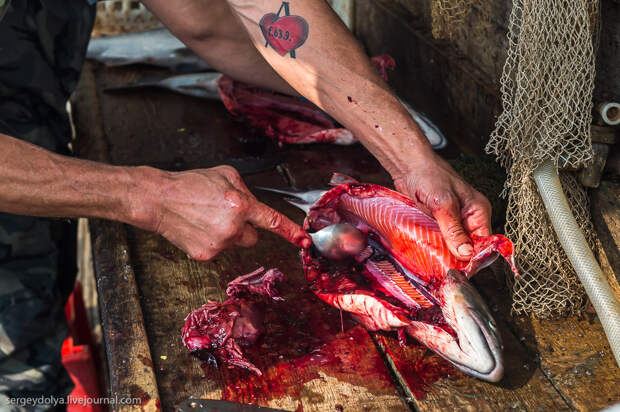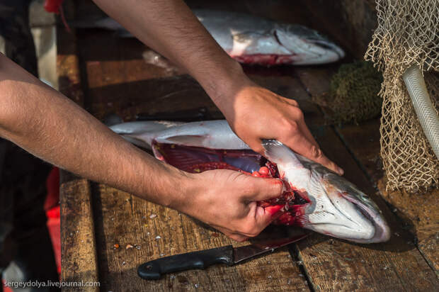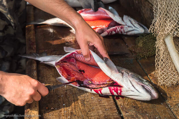 Не буду перечислять полезные свойства свежей икры и её богатство на всяческие микроэлементы. Перейдем сразу к процессу приготовления. Перед нами только что пойманный кижуч (это такой вид рыб семейства лососёвых). Первым делом необходимо рыбу вспороть:
