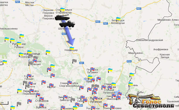 9-57, Поступает информация нуждающаяся в проверке, что через Старобельск в сторону Луганска движется колонна САУ и БТРов. Сообщается, что это подразделения ВСУ и карательного батальона Айдар.