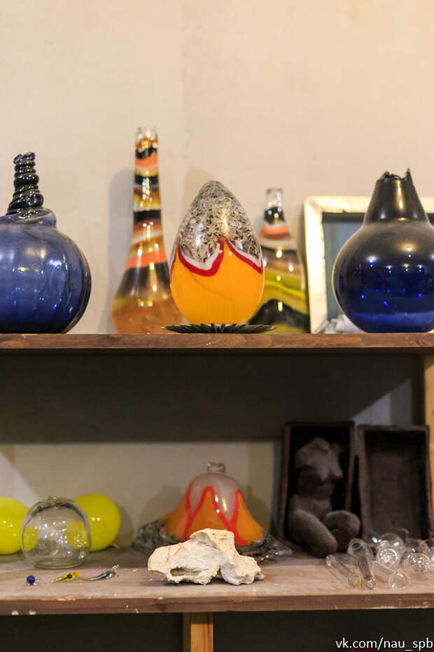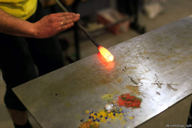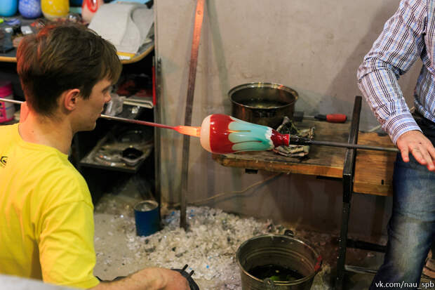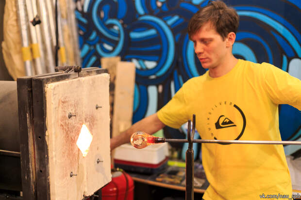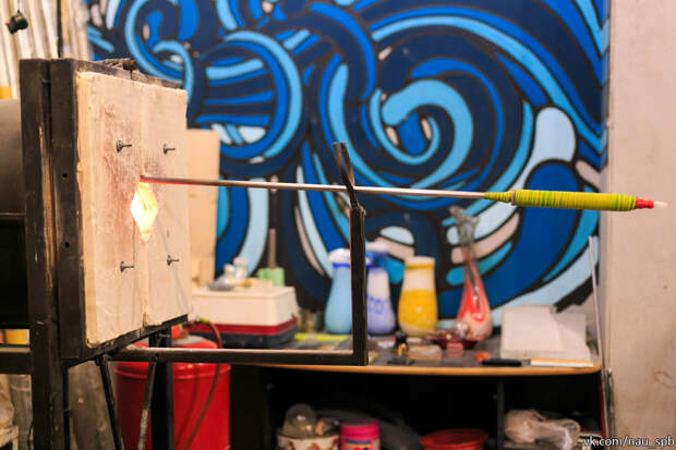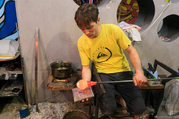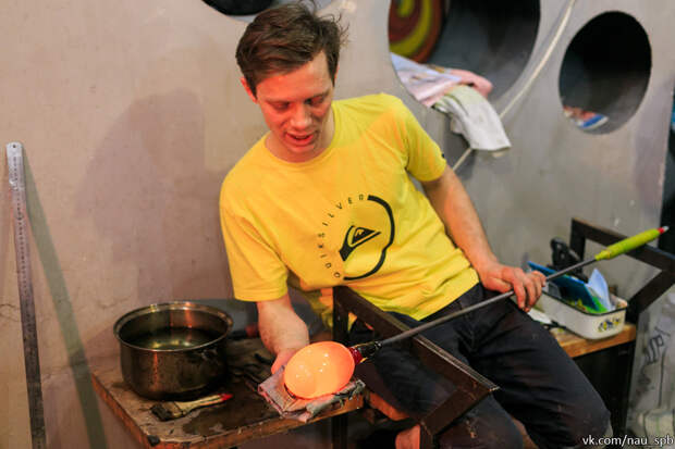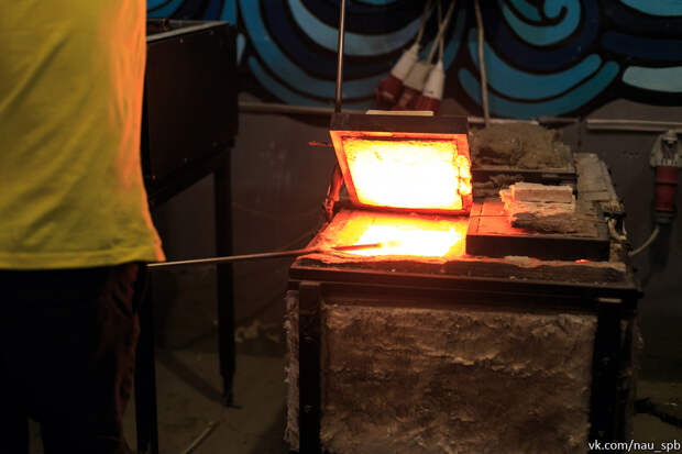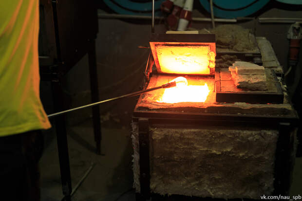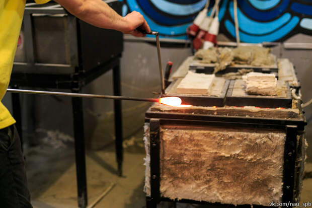 Наше знакомство с Егором началось с небольшого вступительного слова мастера. Он нам поведал, что он самоучка, учился на видео из интернета, какой-то отечественной литературы по стеклу как таковой нет, поэтому приходилось изучать западную. С русскими мастерами из академии Штиглица, например, тоже общение не сложилось, т.к. те старперы считают, что если возьмут его на работу или на учёбу к себе, то он все секреты ремесла у них выведает и убежит создавать свою фирму, тем самым создаст им конкуренцию. В итоге, Егор не сложил рук и не уехал на Запад, как многие могли бы сделать, а получив несколько уроков на практике от преподавателя художественного ВУЗа, затем своими руками начал творить, создав 3 печи и подготовив всю необходимую базу.