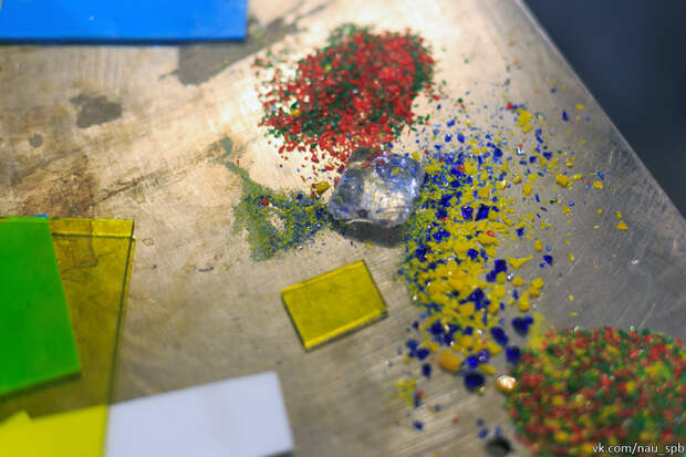 2. Основа - это стекло, разумеется. Егор закупает американское, т.к. цветов полно, оно качественное, а в России всё с этим сырьем плохо, его мало и не достать. Стекло закупается либо в виде подобных листов-пластин, либо в форме кубиков, что в принципе всё равно, ведь в печи всё растапливается.
