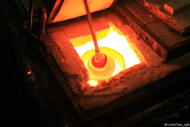 8. Жидкое стекло берётся трубкой из стеклоплавильной печи и начинается процесс создания болванки для изделия. В нашем случае это ваза!